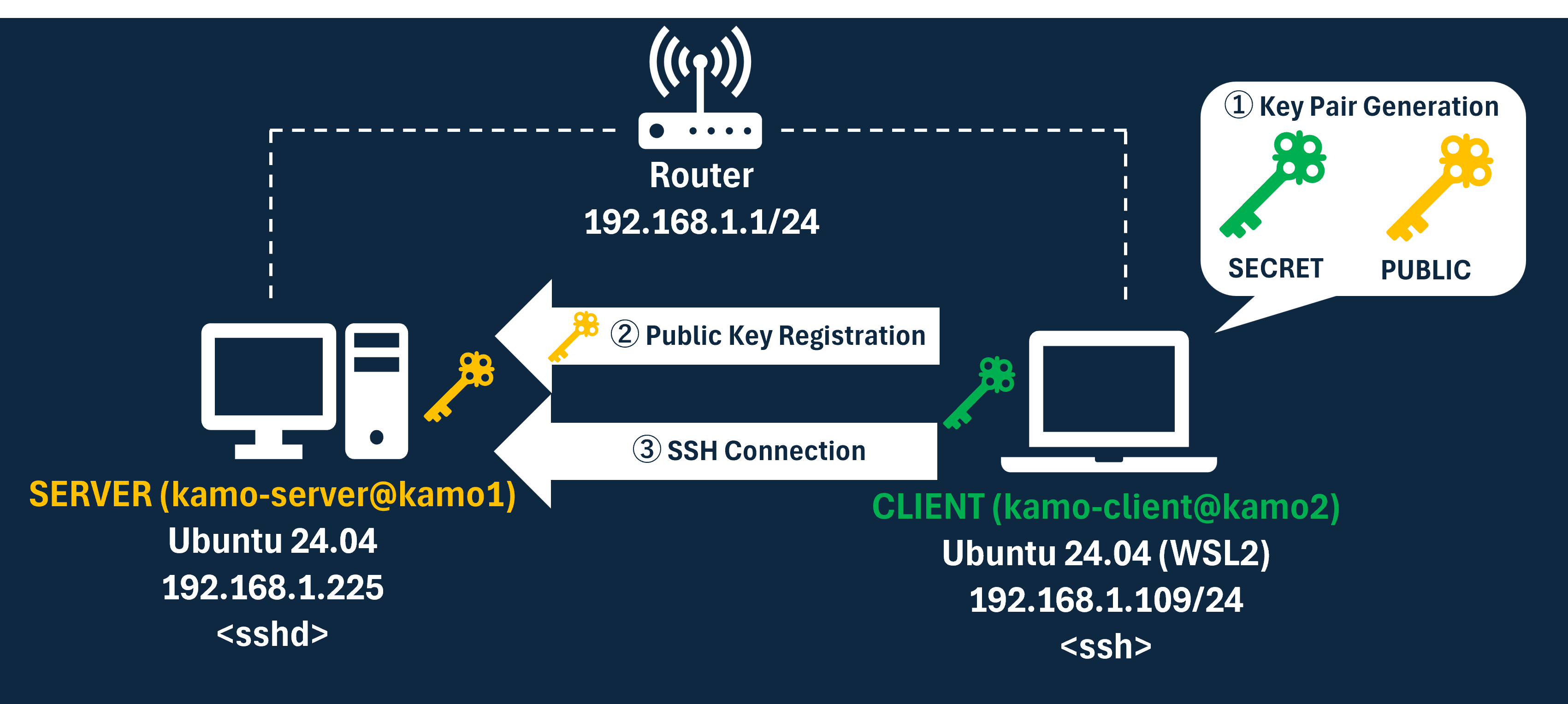 ここでは、公開鍵認証の流れを次の3手順で実施します。