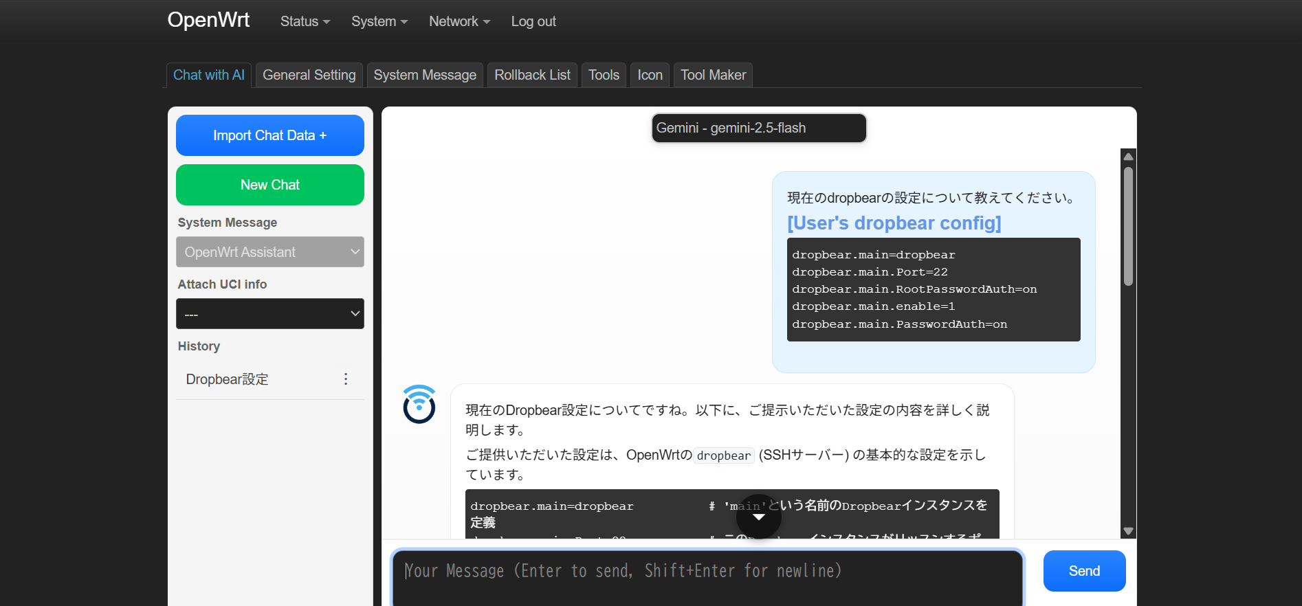 この項目をクリックすると、OpenWrtの設定が表示されますので解析させたものを選んだ上でAIにメッセージ を送ってください。