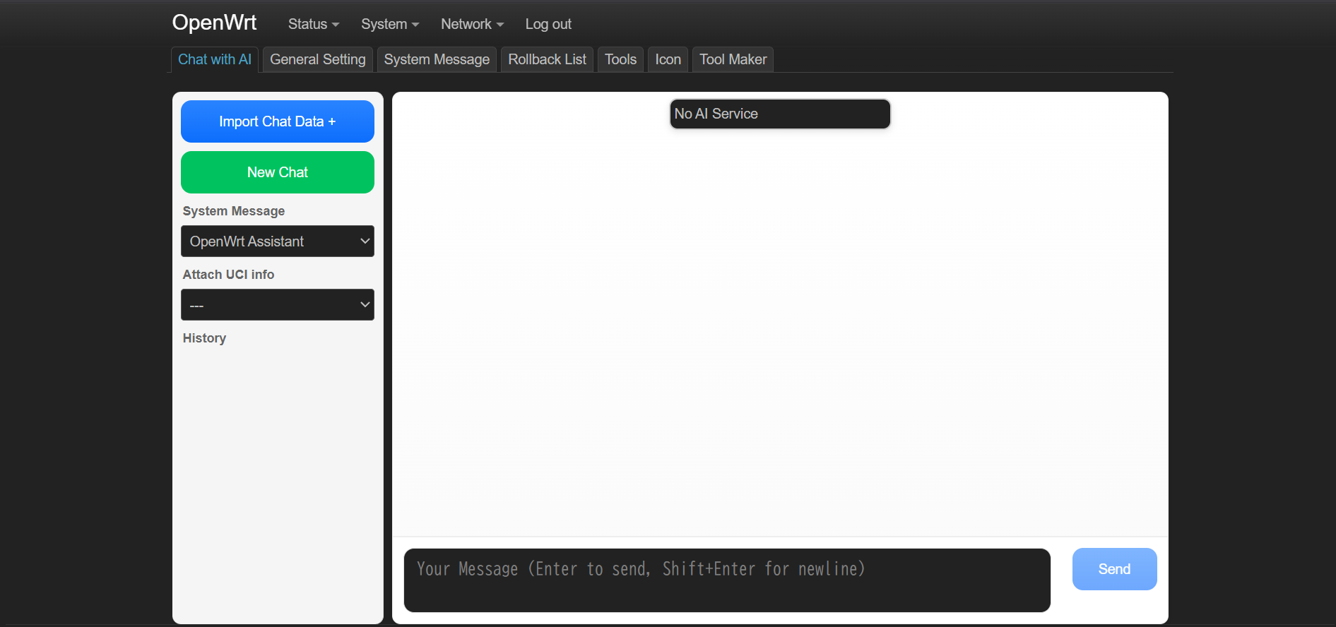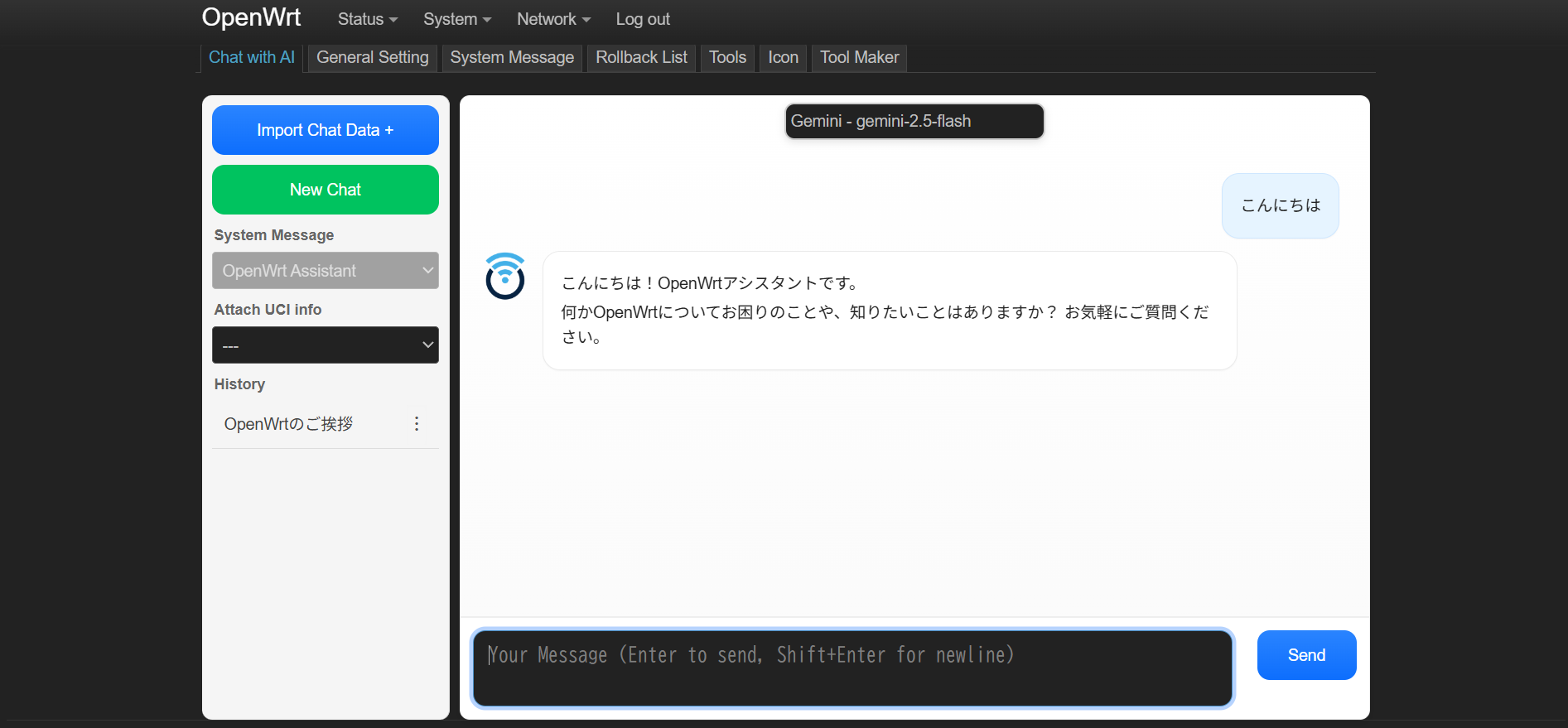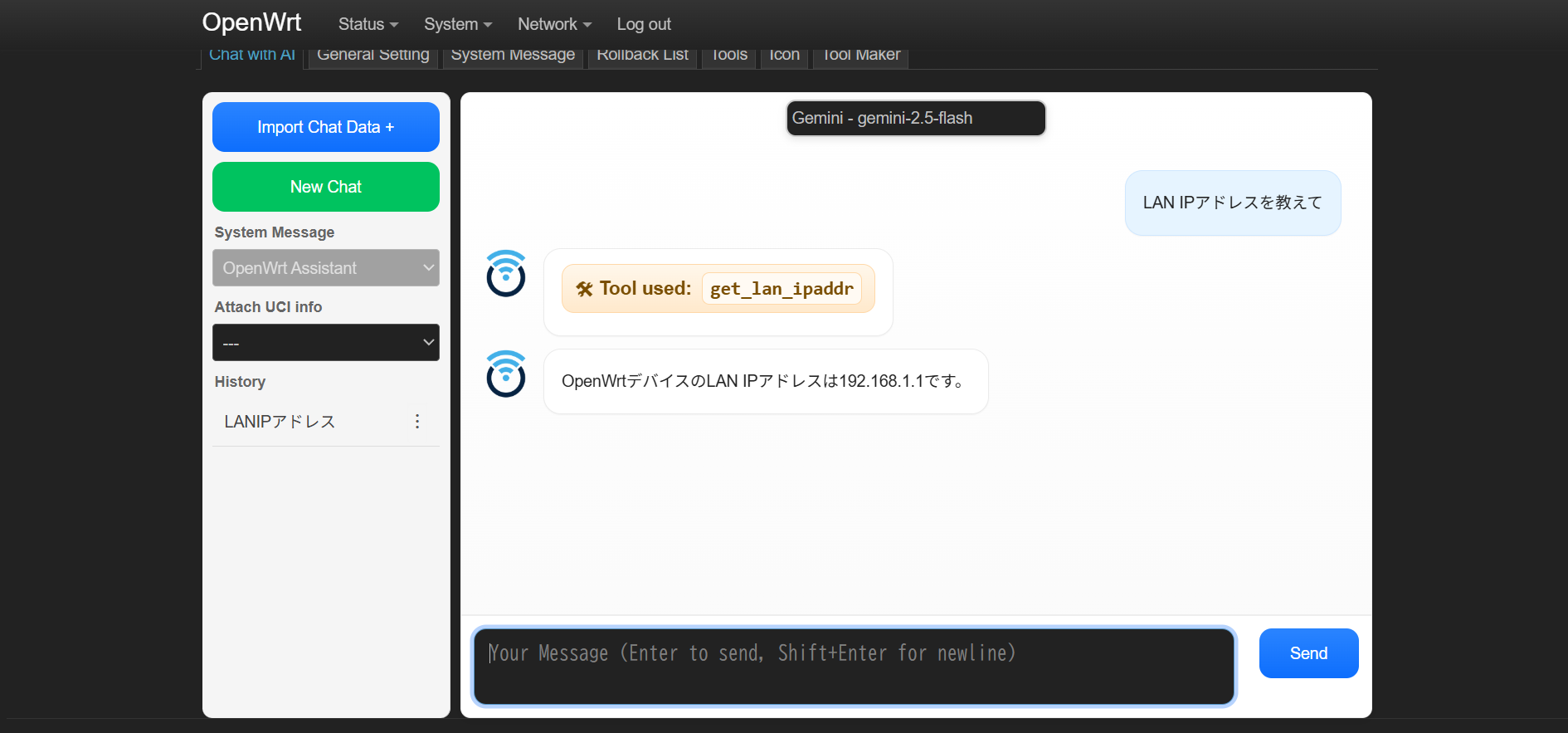 ただAIとユーザーが会話できるだけでなく、AIがユーザーの要望に従ってOpenWrtを操作することができます。