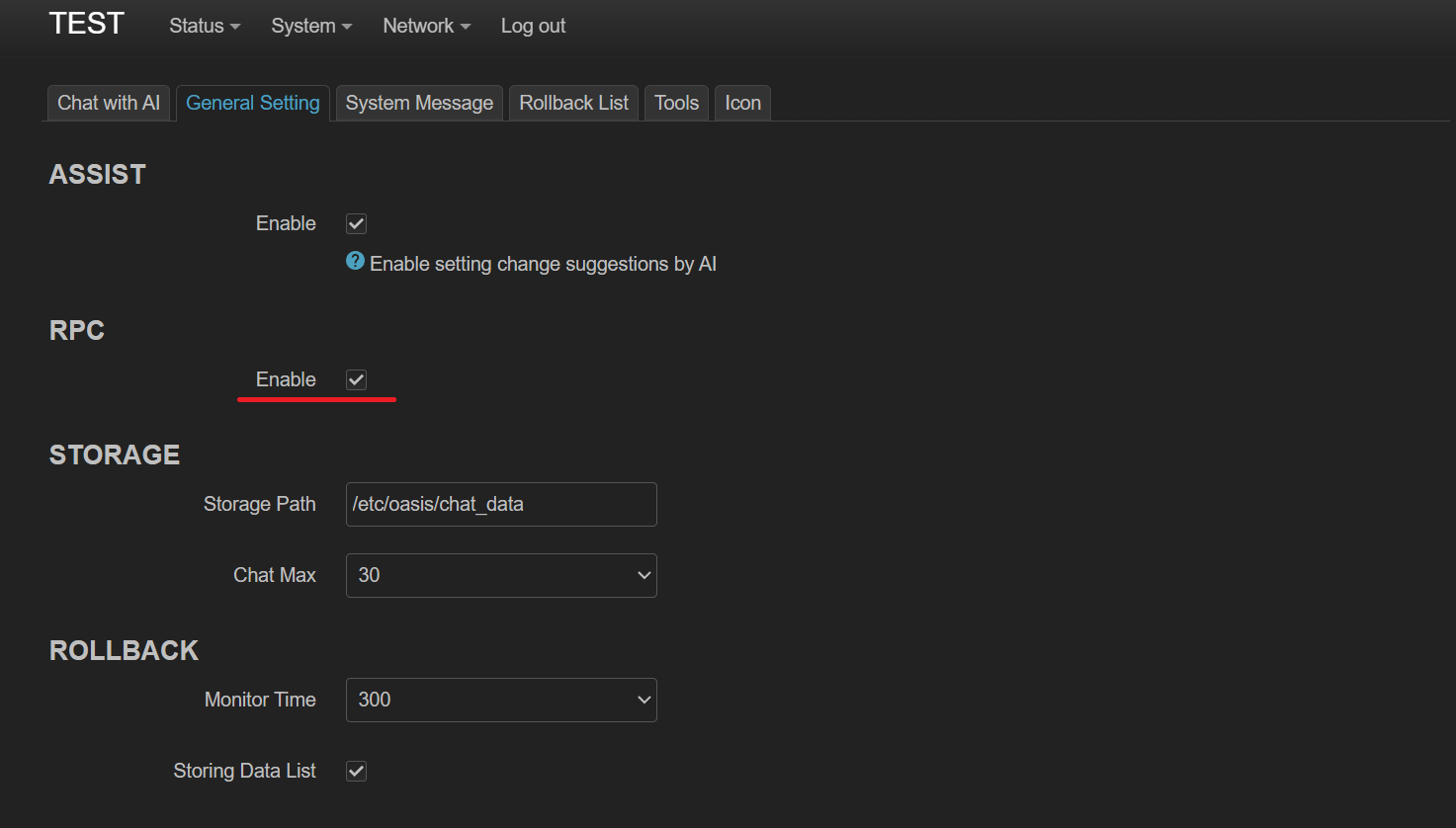 このアプリはOpenWrtデバイスにインストールされたOasisと連携してAIと会話できるようになります。 そのため、OasisのGeneral Settings項目内でAIサービスの接続設定を追加した上でRPC項目のラジオボタン(Enable)にチェック入れる必要があります。