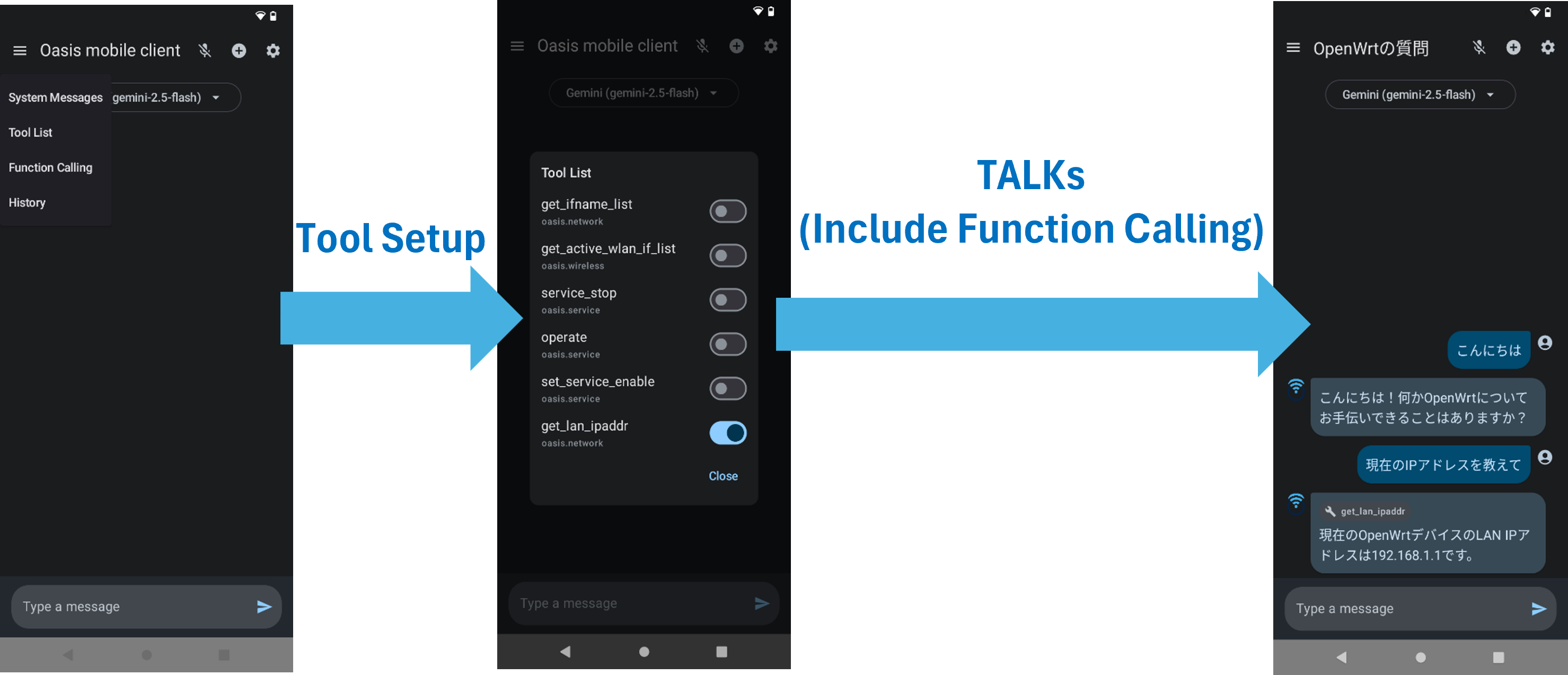 そのため、Function Callingという機能を利用してOpenWrtデバイスの内部機能(AIツール)をAIが認識して実行できます。