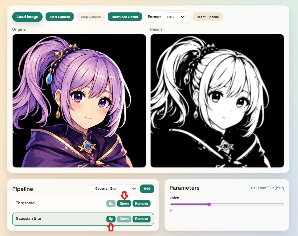 例えば以下のように最初に二値化(Threshold)、次にガウシアンフィルタ(Gaussian Blur)を適用している場合、 次の図の赤矢印で示すUp/Downキーを押せば適用順番を変更できます。