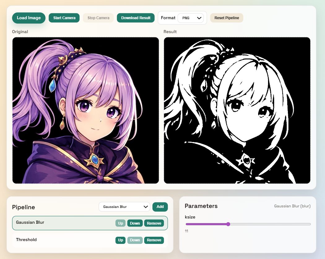 - Threshold(二値化): 明るさで白/黒の 2 色に分けます(文字や形の抽出向き)。